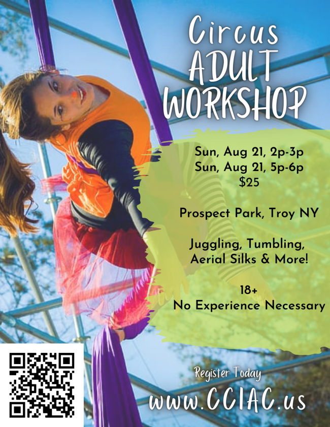 Join CCIAC for 18+ workshops to experience aerial and ground based circus skills under the CCIAC big top circus tent in prospect park! No previous experience necessary, grab a friend and join us for a new adventure!