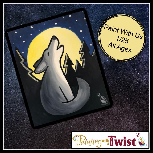 Come howl at the moon and paint "AWOOOO" with step by step instructions! Paint and canvas included! Bring your own snacks and lets have a wonderful time!