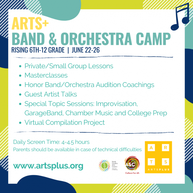 The Arts+ Concert and Jazz Band Camp has been a staple in the Charlotte region for nearly two decades. This summer we bring camp to you virtually! You'll still receive the same level of instruction you've come to expect from Arts+ and more!