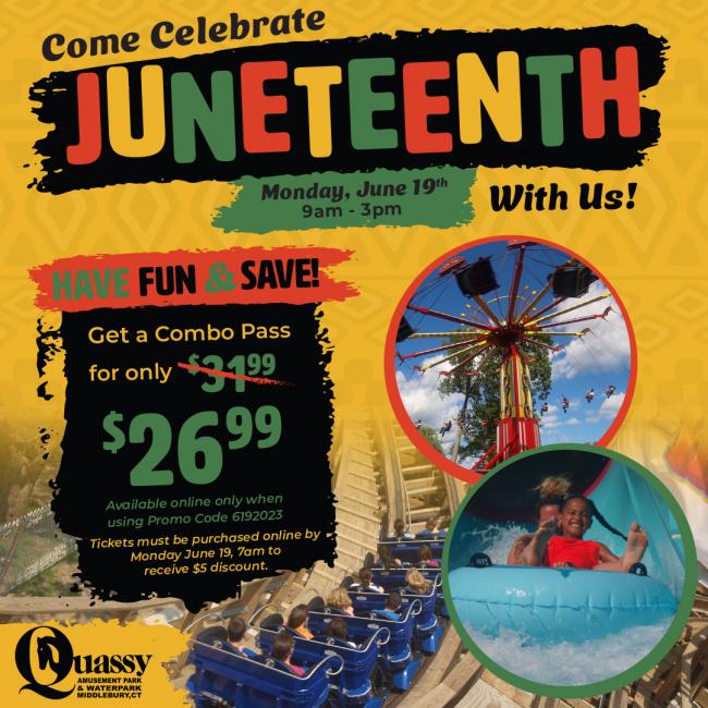 Celebrate Juneteenth at Quassy and get a Combo Pass for only $26.99 when you buy online using the promo code 6192024. Tickets purchased with this promo code are valid on Wednesday, June 19 only. Tickets must be purchased online by 7am on 6/19/24.