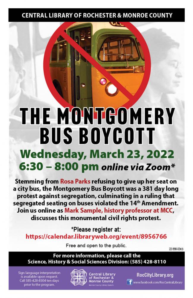 Join us for this online *Zoom program about The Montgomery Bus Boycott. This will be presented by Mark Sample, History Professor from MCC.