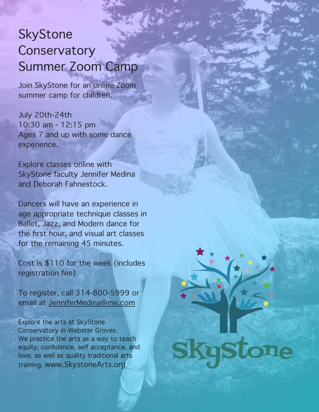 Join SkyStone Artistic Director Jennifer Medina and Co-Director Deborah Fahnestock for classes in Dance and Visual Arts July 20th - 24th 2020 10:30 am to 12:15 pm Ages 7 to 11