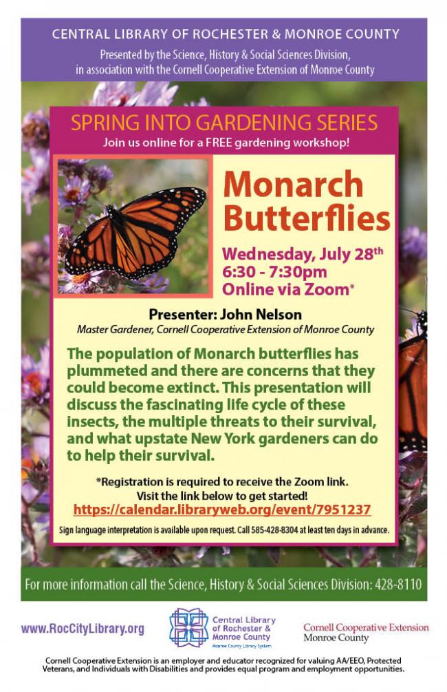Join us for an online Zoom program about Monarch Butterflies, presented by John Nelson from the Cornell Cooperative Extension of Monroe County on Wednesday, July 28 at 6:30 pm