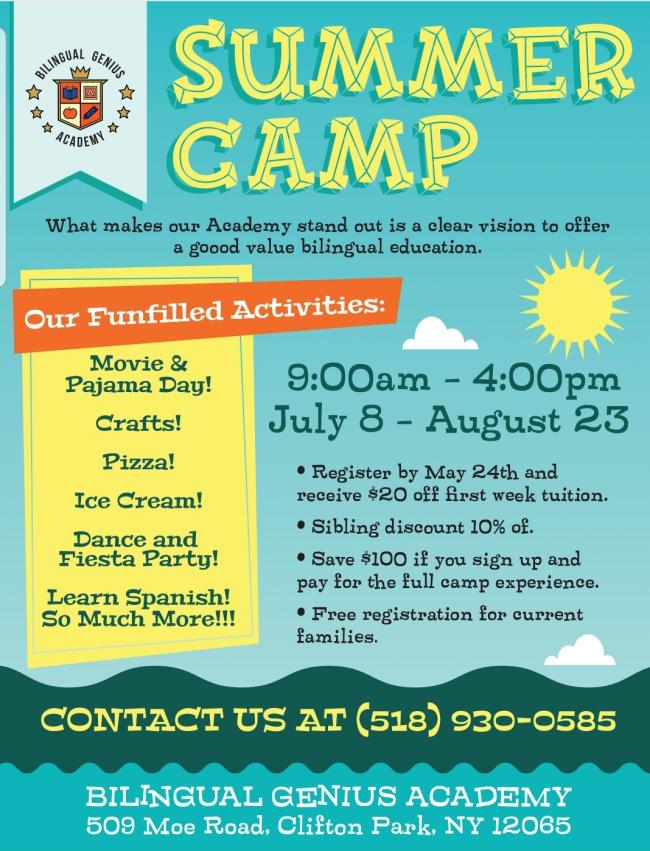 Come join us for our funfilled Summer Camp at Bilingual Genius Academy on July 8th-August 23rd from 9:00am-4:00pm.
