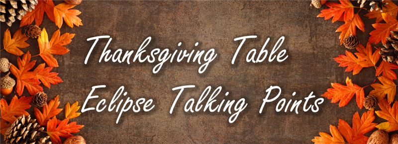 Thanksgiving presents an excellent opportunity to spread the word about the eclipse AND avoid those awkward topics you always dread during family gatherings! There's everything great and nothing negative about an eclipse... nothing to tiptoe around... with so much fun stuff to talk about that even your pugnacious Uncle Ed will find it charming. So just let it dominate the conversation! Your friends and family are going to want to be here on April 8, and they need to be prepared. So consider yourself deputized! These Thanksgiving Table Talking Points will help you regardless of whether you're hosting Thanksgiving in Rochester or traveling outside the path of totality to someone else's table.